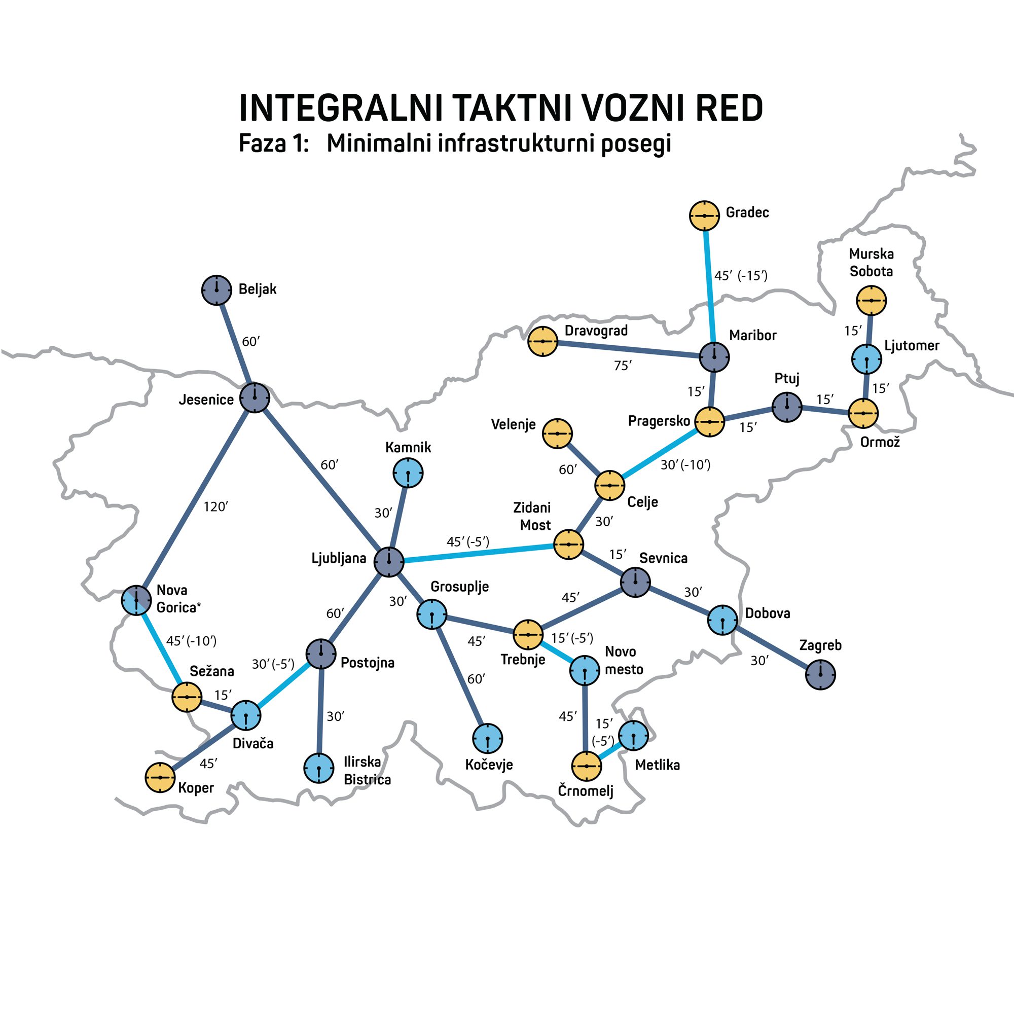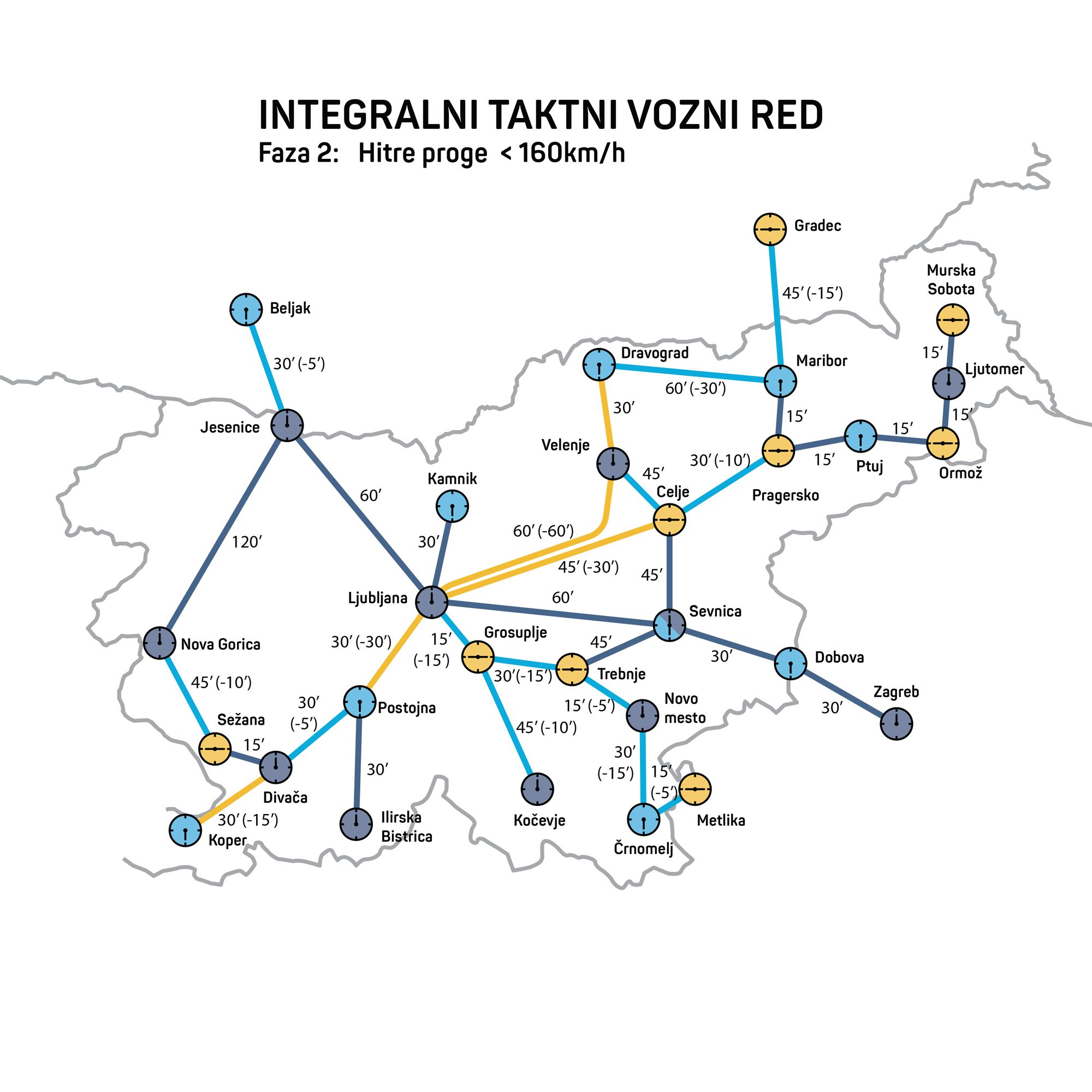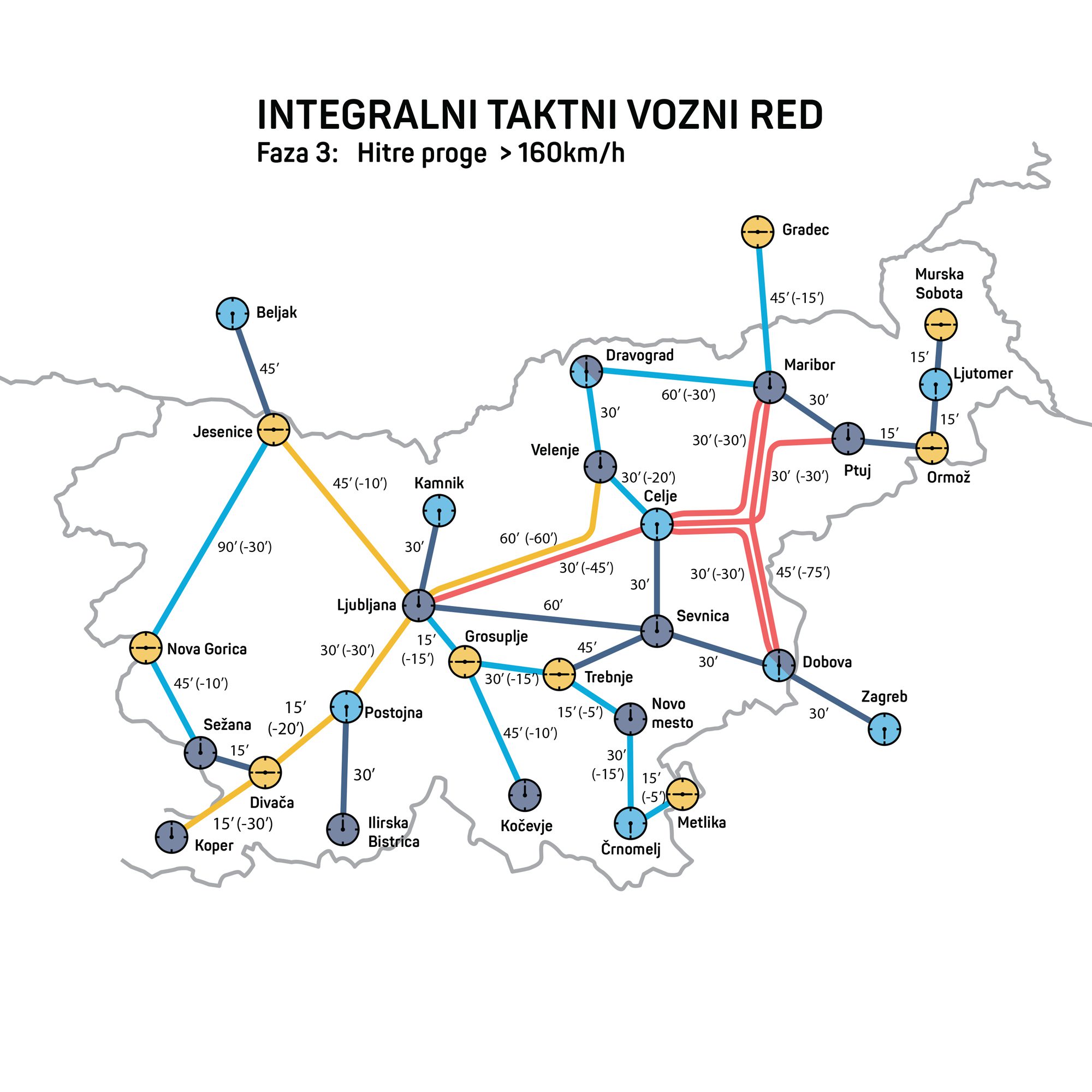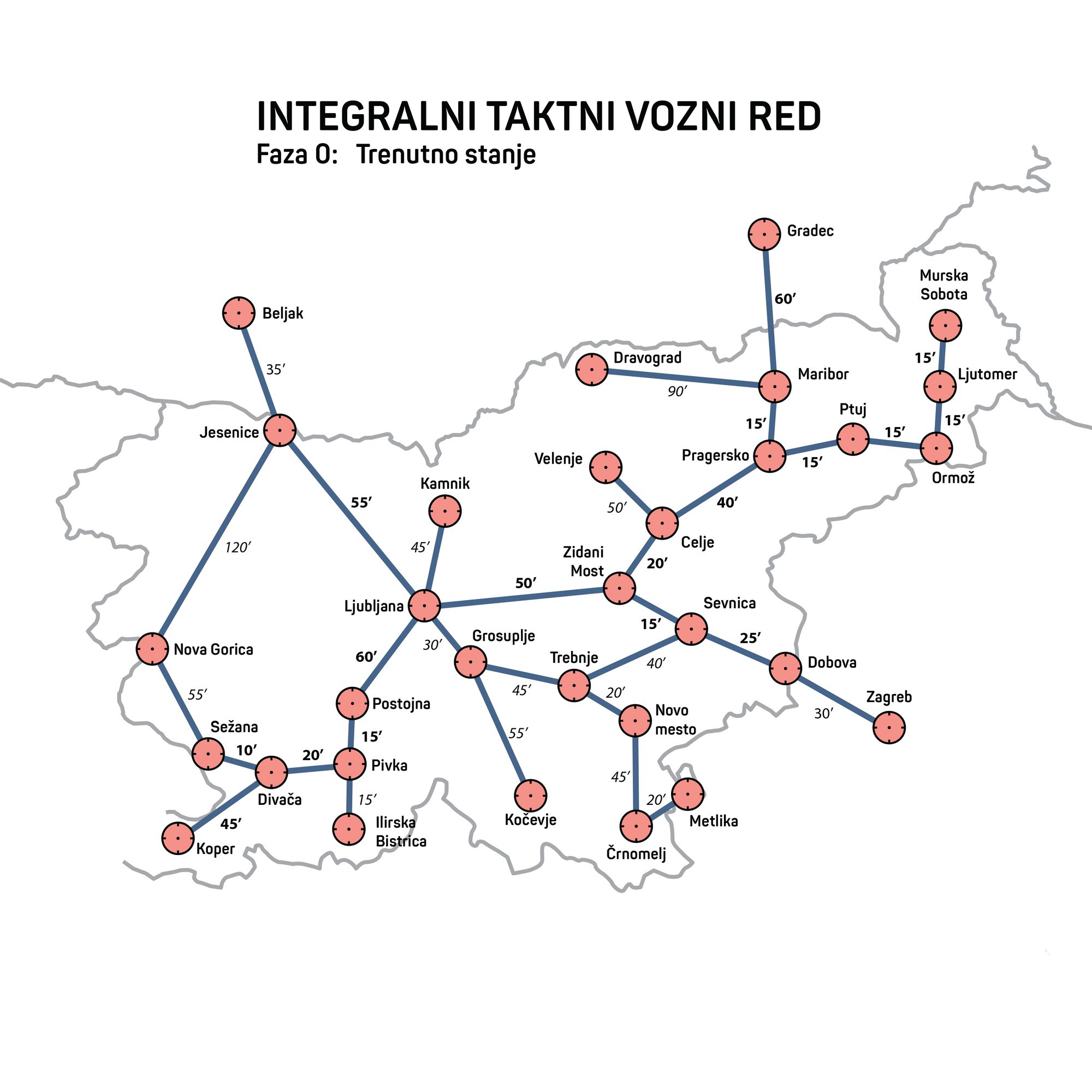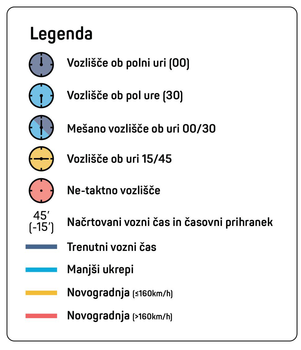 Dr. Nejc Geržinič je izpostavil, da je delež potniških kilometrov, opravljenih z vlakom, v Sloveniji med najnižjimi v Evropi. Če upoštevamo razvitost in gostoto prebivalstva, smo z 1,8 odstotka celo na najnižjem mestu: “V primerljivih državah je poti z vlakom tudi do petkrat več, in v skoraj vseh deluje taktni vozni red. Trenutno smo v Sloveniji sredi obdobja velikih investicij v infrastrukturo, nezadovoljstva s ponudbo javnega prevoza in nacionalnih prizadevanj za večjo trajnost. Taktni vozni red je ključen ukrep, saj preprečuje nepotrebna vlaganja in omogoča, da javna sredstva usmerimo v izboljšave, ki koristijo potnikom, in železnice razvijamo postopoma.” Primer fazne izboljšave je na primer povezava Ljubljana – Maribor. Že z manjšimi posegi bi lahko potovalni čas skrajšali za petnajst minut. Naši največji mesti bi tako lahko postali vozlišči, kjer se vlaki iz različnih smeri srečajo v nekaj minutah ob vsaki polni uri. Z gradnjami novih prog in nakupom novih vlakov bi se potovalni čas med mestoma sčasoma še skrajšal.