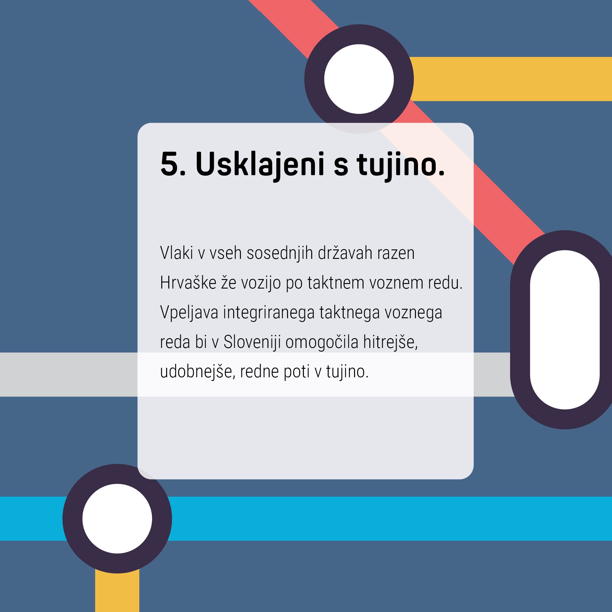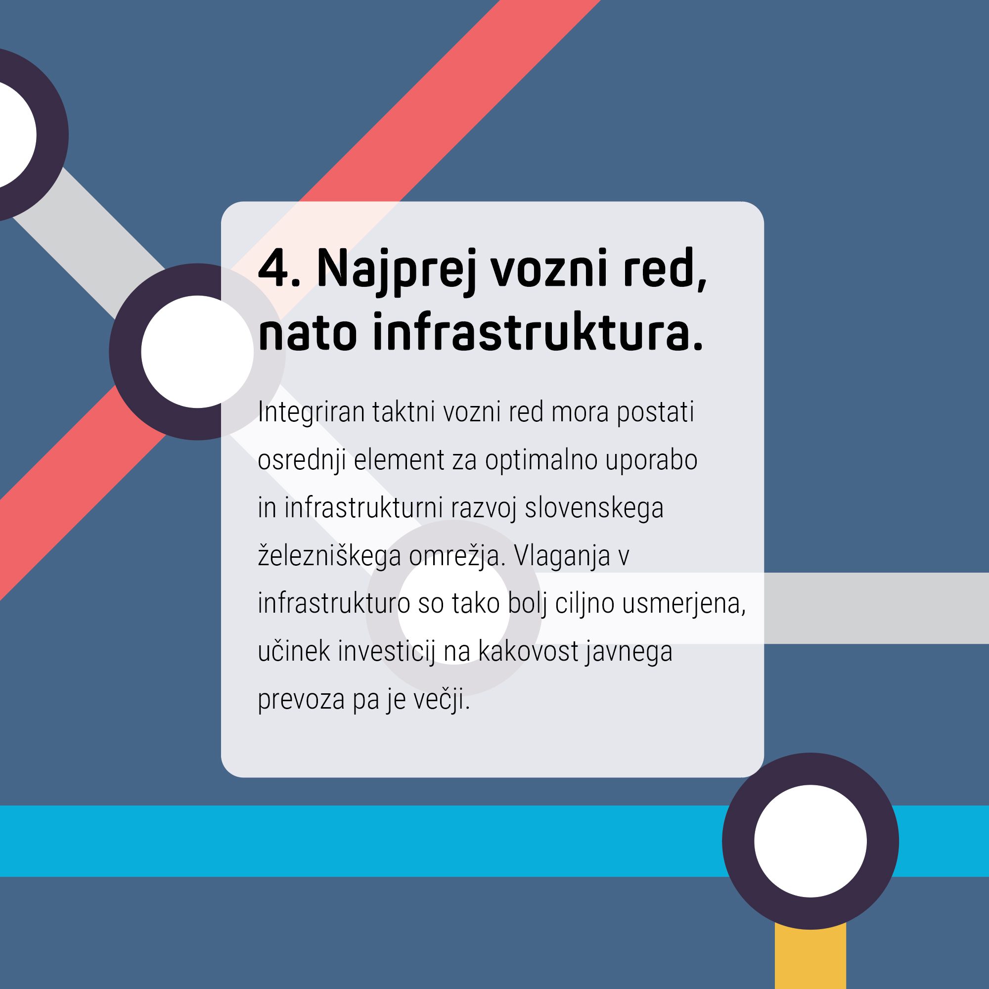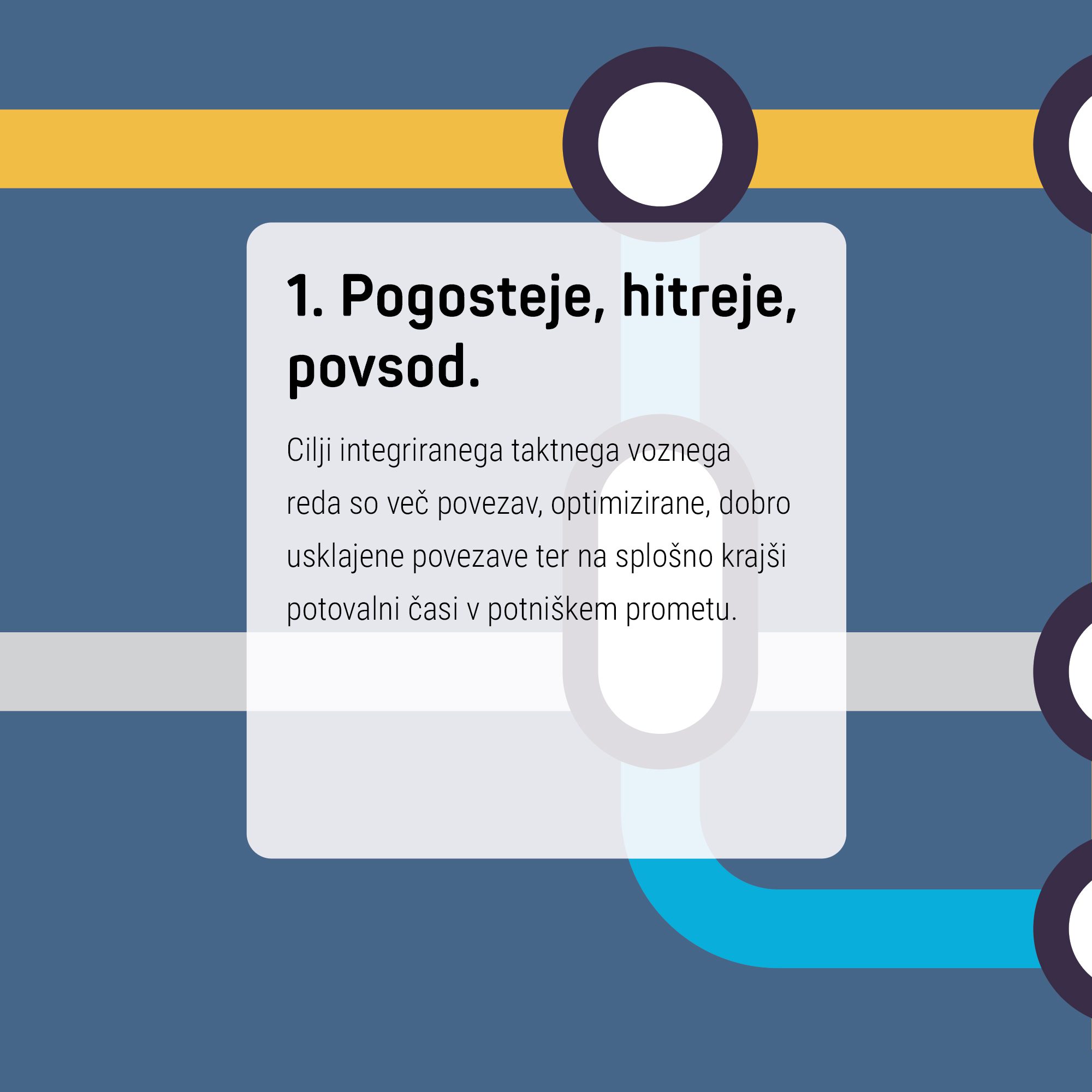 Glede na velike investicije v železniško infrastrukturo, nezadovoljstvo s trenutno ponudbo javnega prometa v Sloveniji in nacionalna prizadevanja za večjo trajnost gre za ključen ukrep, ki potnikom prinaša več dobro usklajenih povezav in krajše potovalne čase. Načrtovanje po principu taktnega voznega reda poveča učinkovitost, zanesljivost in dostopnost javnega prometa, obenem pa preprečuje nepotrebno porabo javnih sredstev.